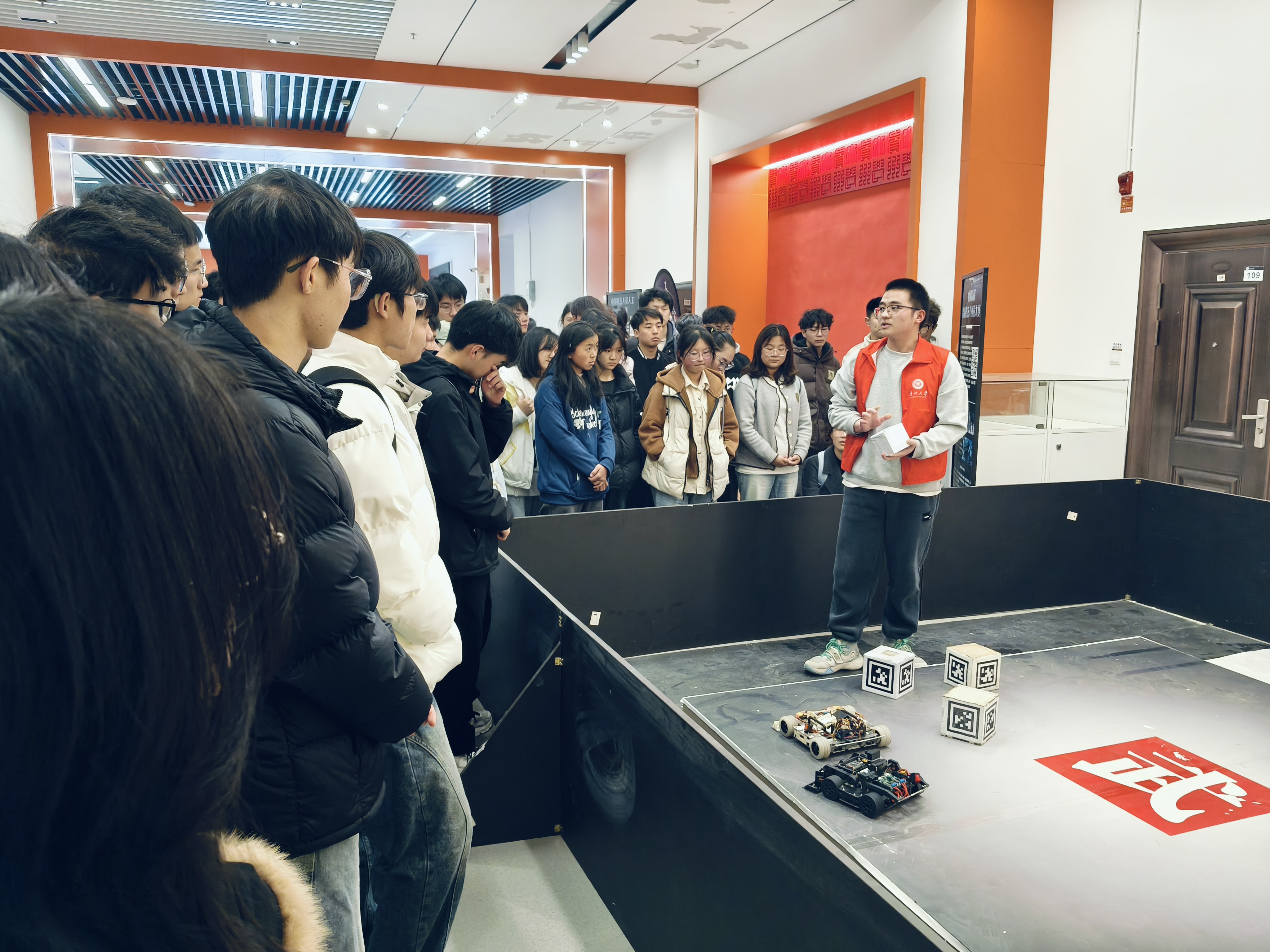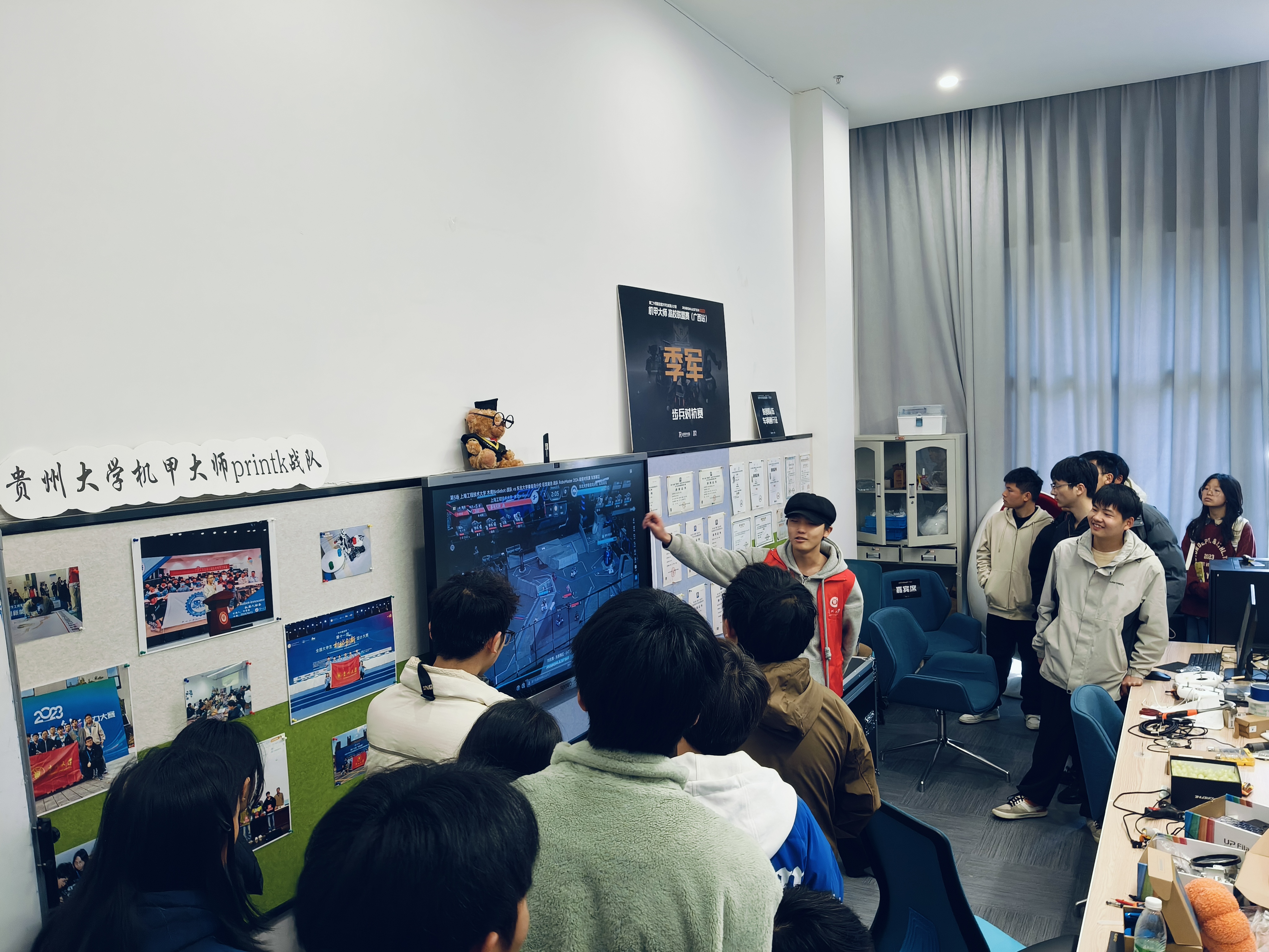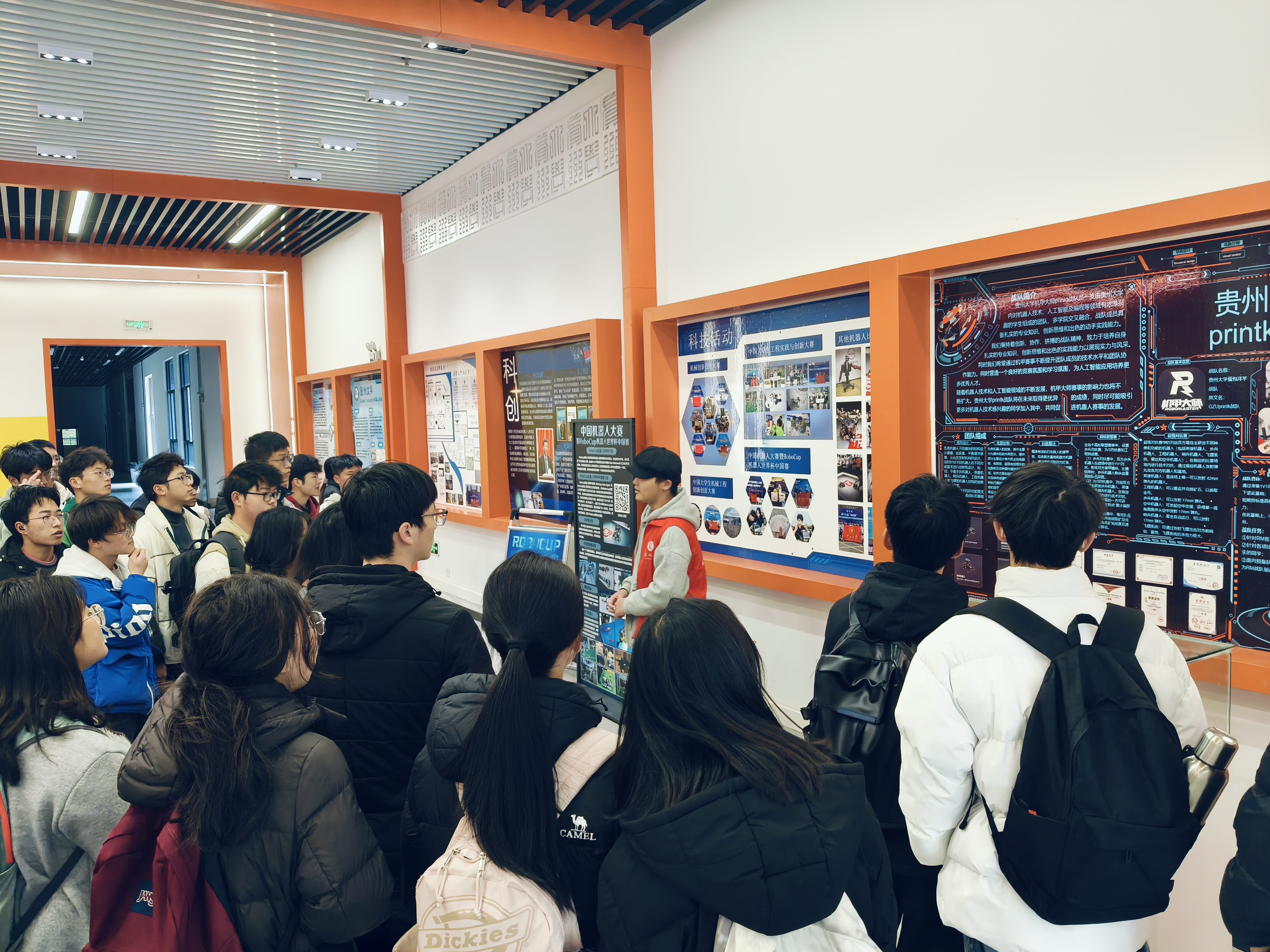 正式介紹優(yōu)秀作品前,馭想俱樂部負(fù)責(zé)人楊春白雪向同學(xué)們介紹習(xí)近平總書記給中國國際大學(xué)生創(chuàng)新大賽參賽學(xué)生代表回信內(nèi)容。隨后楊春白雪和機(jī)器人社團(tuán)負(fù)責(zé)人田景怡分別對兩個科創(chuàng)社團(tuán)進(jìn)行了介紹并對相關(guān)賽事進(jìn)行解讀,還向大家展示了貴州大學(xué)代表隊的獲獎作品。在參觀robomaster工作室時,獎杯墻令人震撼。同學(xué)們表示一個個獎杯背后的故事更令人欽佩,激勵機(jī)械青年守正創(chuàng)新,再創(chuàng)佳績。
