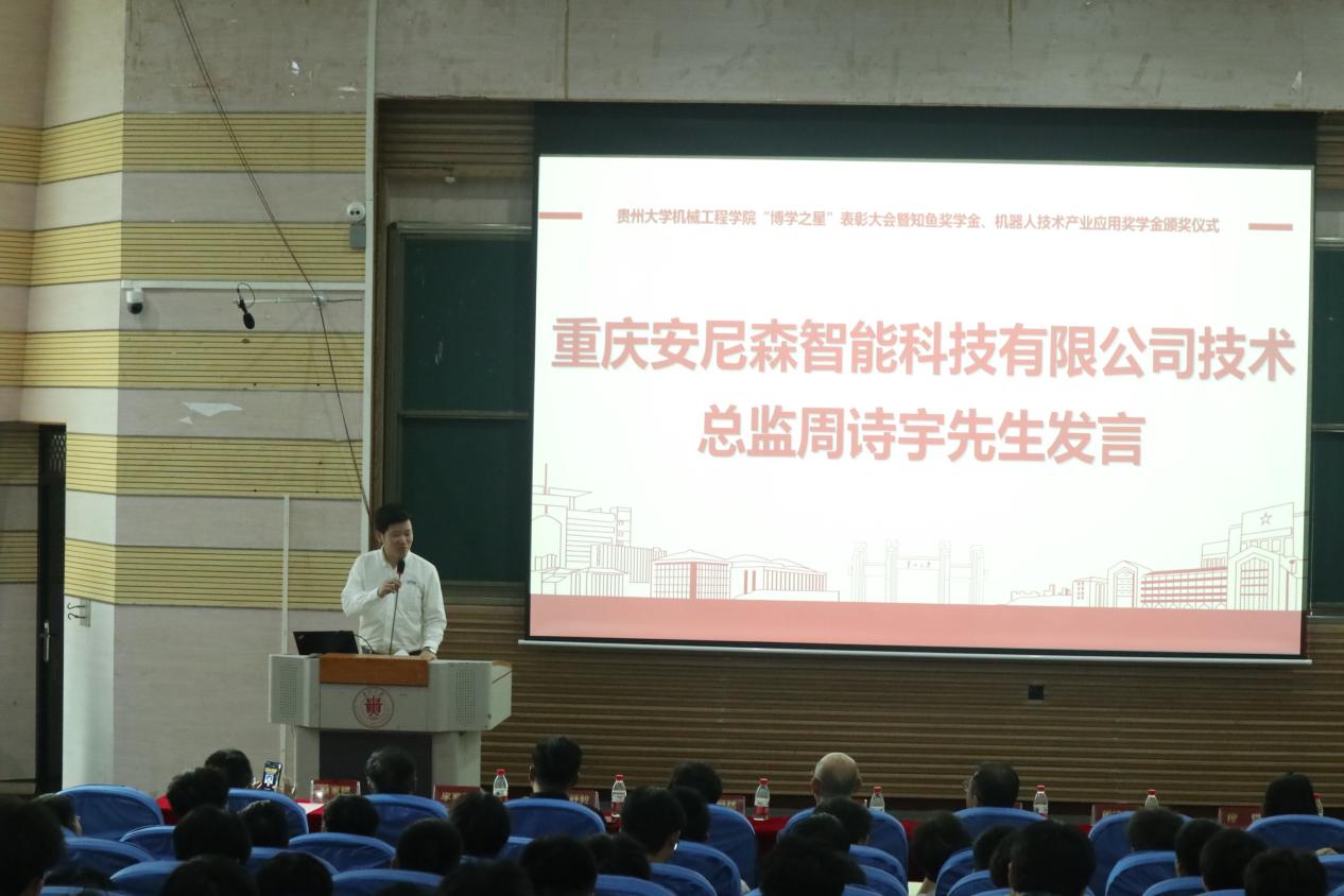 韓陽(yáng)先生介紹企業(yè)艱難的發(fā)展過(guò)程,遇到的難題及解決辦法,鼓勵(lì)同學(xué)們要堅(jiān)持克服困難努力拼搏。同時(shí)也強(qiáng)調(diào)人才對(duì)于制造業(yè)升級(jí)的關(guān)鍵作用,希望機(jī)械學(xué)子爭(zhēng)做復(fù)合型人才,并對(duì)獲獎(jiǎng)學(xué)子寄予厚望,期待未來(lái)有更多機(jī)械學(xué)子加入產(chǎn)業(yè)報(bào)國(guó)行列。重慶安尼森智能科技有限公司技術(shù)總監(jiān)周詩(shī)宇講述他的成長(zhǎng)經(jīng)歷,分享科技創(chuàng)新心得,鼓勵(lì)同學(xué)們夯實(shí)基礎(chǔ)、勇于探索,積極投身智能制造領(lǐng)域,為產(chǎn)業(yè)發(fā)展賦能新質(zhì)生產(chǎn)力。