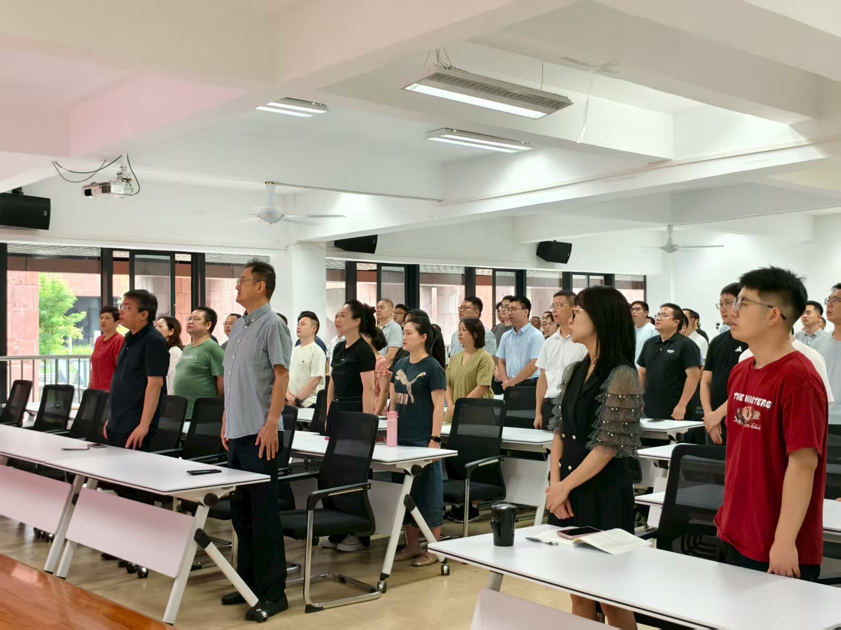閱兵式上,禮炮鳴響、國歌奏響,師生們起身肅立,與屏幕中的受閱方陣同步高唱國歌。