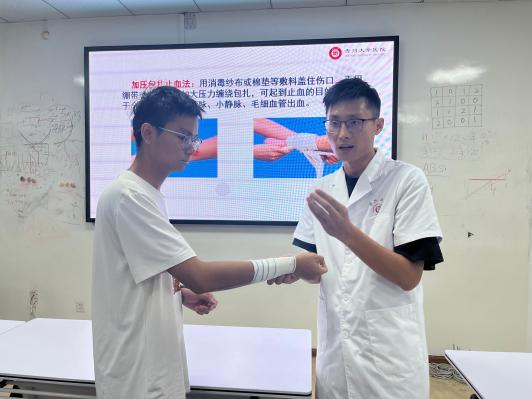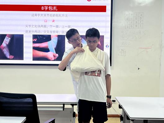 接著,姚云騫老師分享了關(guān)于“創(chuàng)傷救護”的急救知識。他普及一個“先救命,后治傷”的救護原則,并現(xiàn)場演示了直接壓迫止血,加壓包扎止血,8字包扎法,三角巾膝關(guān)節(jié)帶式包扎,骨折固定等救護方法。