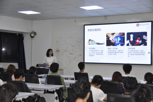 首先,雷蕾院長為我們講解了常見的運動損傷預(yù)防及處置。她強調(diào)“充分熱身”“整理活動”的重要性,秉持“預(yù)防優(yōu)先”原則,講解肌肉拉傷、關(guān)節(jié)扭傷、抽筋、運動性腹痛等常見損傷的識別方法和如何進行緊急處理,防止傷害加深。同時從運動營養(yǎng)、水分補充、睡眠重要性三方面,建議學(xué)生在訓(xùn)練前后科學(xué)補充碳水化合物與蛋白質(zhì),運動中或后選擇淡鹽水或運動飲料補水,更強調(diào)睡眠對肌肉恢復(fù)、體能儲備的關(guān)鍵作用,糾正學(xué)生不良習(xí)慣,助力鍛煉效果最大化。